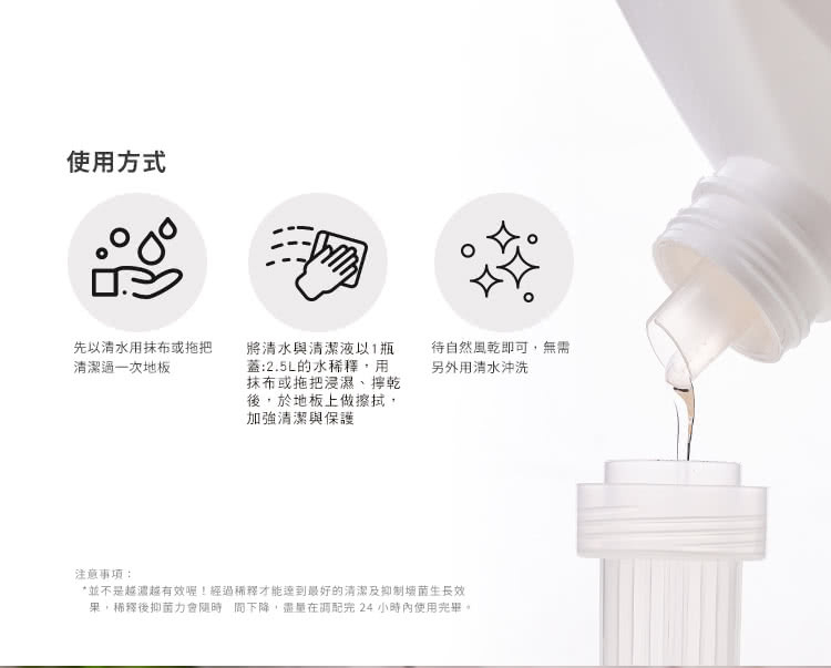 ‧將清水與清潔劑以1000ml:1瓶蓋的水稀釋 ,只要擦拭一次,除臭效果可持續一周以上.